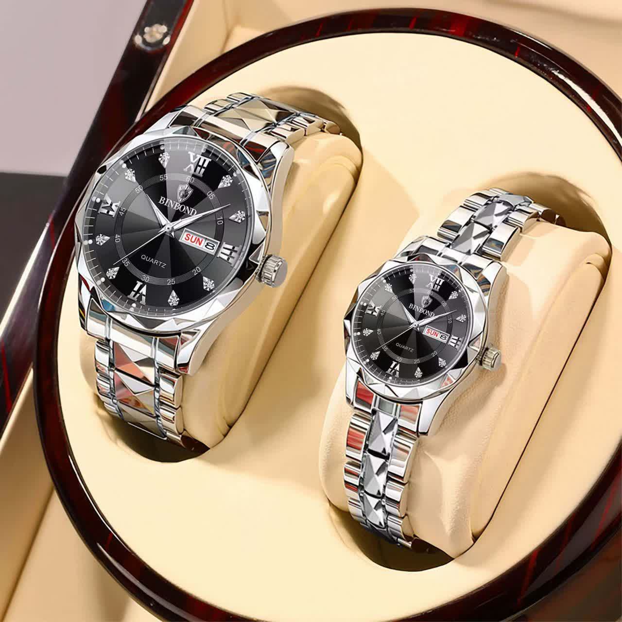 استاین ست با کیفیت عالی و طراحی بینظیر مورد پسند جوانان خوش پسند و زوجین خوش سلیقه است ست بین باند مقاوم در برابر آب و شب نما است دارای روز شمار و ایام هفته میباشد شیشه این مدل ساعت الماسی و بند استیل فولادی دارد قفل دو پروانه و موتور ساعت کوارتز است